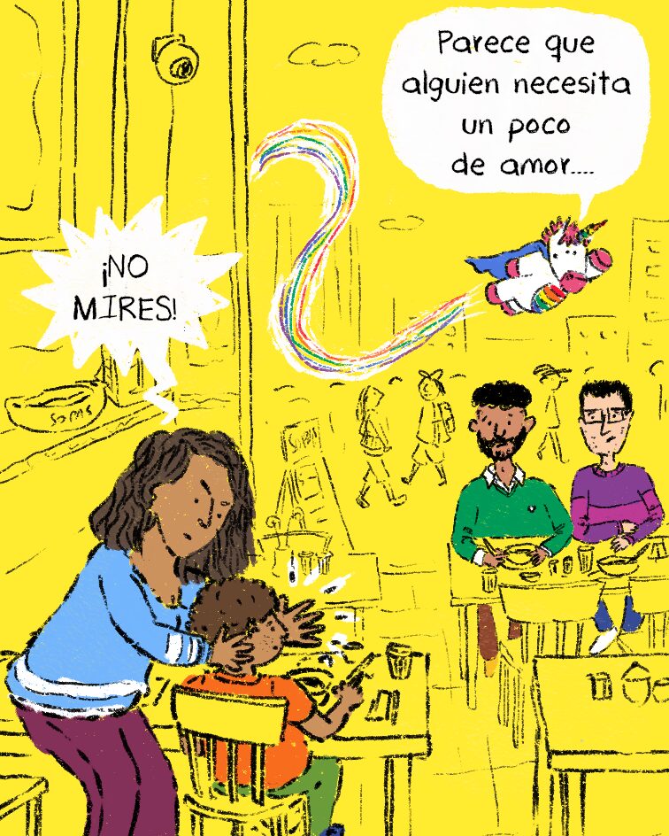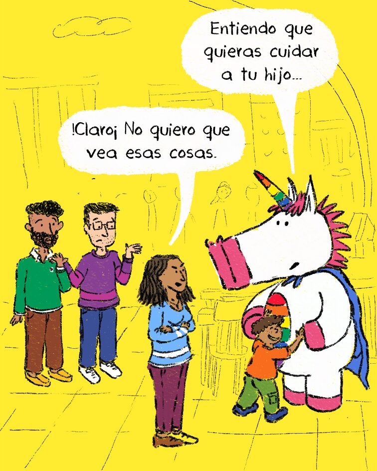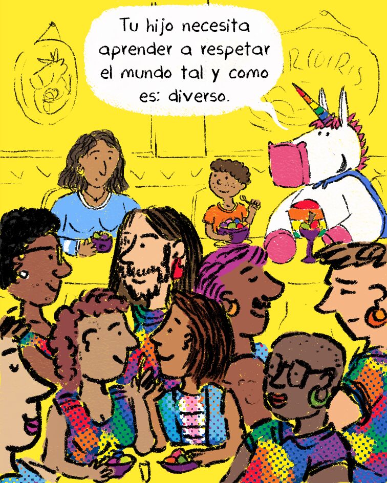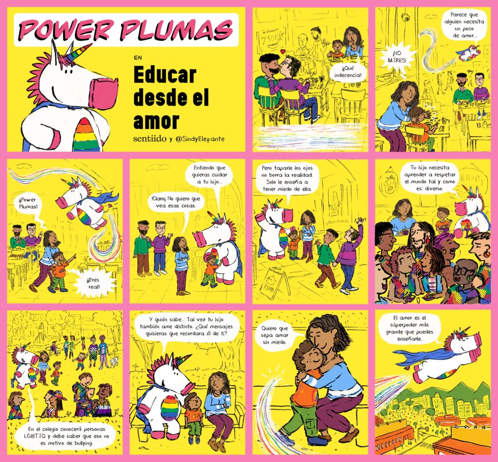 En este cómic, una mamá pretende ocultarle a su hijo la existencia de una pareja diversa que está frente a ellos. La llegada de Power Plumas abre la conversación sobre lo que realmente significa cuidar: no es esconder la diferencia, sino acompañar, explicar y cultivar respeto. (Ver: Power Plumas en un mundo en armonía).